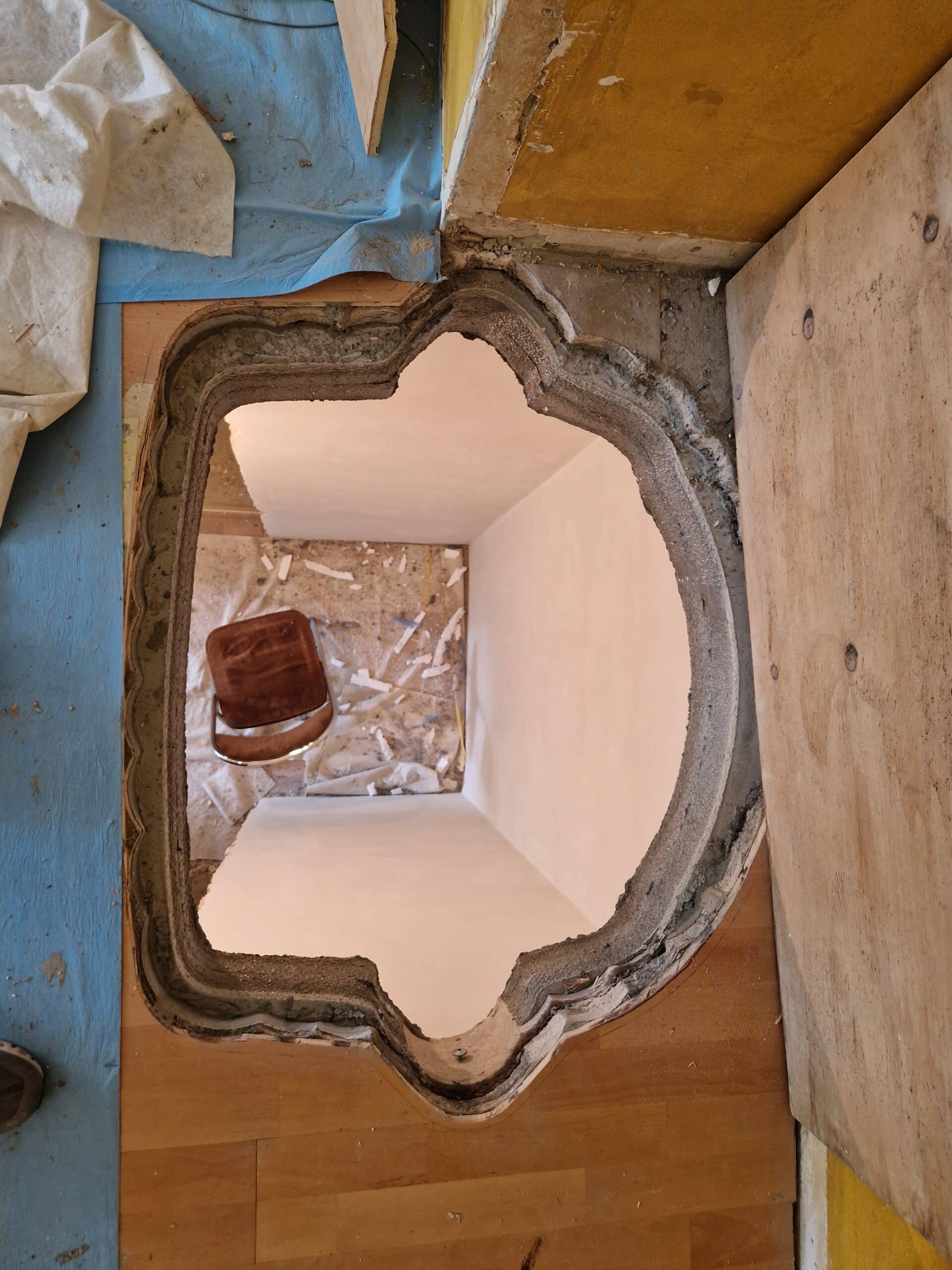 Die Deckenöffnung für das System „MyHomelift“ wird mittels diamantbesetzter Werkzeuge im Kernbohr-Perforationsverfahren hergestellt. Dadurch entsteht ein präziser Ausschnitt mit den geforderten lichten Maßen von etwa 1,05 × 0,82 m – millimetergenau abgestimmt auf den geschwungenen Grundriss des Liftmodells.